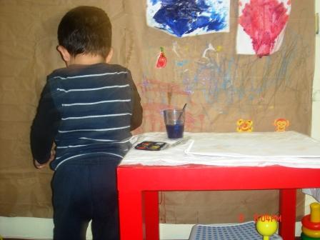 İstediğimiz rengi defterde elde edemezsek duvara dönüp orada renk denemesi yapıyoruz. Duvardaki kağıt çok işimize yarıyor..