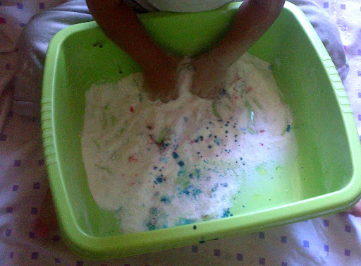 - Bu bizim yaptığımız. Önce 1/4 kap su içine gıda boyası damlatılıyor. Bu su bir leğen içine dökülüyor. Yumurcak su ile boyanarak oynarken. Önüne 1 bardak karbonat konur. 1 bardak sofra tuzu konur. Bunları kaba ilave etmesi istenir. Bunları homojen olana dek karıştırttırırız. Elinde yara olmamasına dikkat edin “yaraya tuz basmak” deyimi gerçekleşmesin ! 😛
