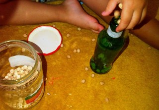 Bunların katı-katı versiyonu. Büyük bir kaptan alıp dar ağızlı kaba aktarımını nohut, bezelye, fasulye gibi doğal eşyalarla yapmak da pek faydalı olacaktır.