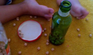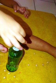 Biz boş bir kavanoza doldurup oradan şişeye aktarma denedik. Sesli olduğundan oldukça ilgi çekiciydi.