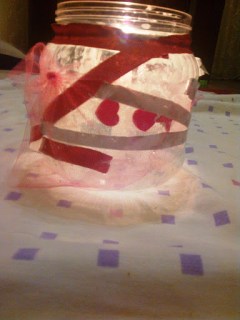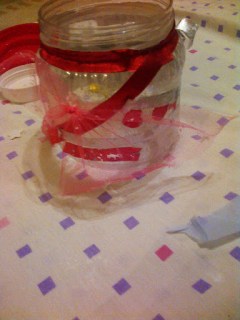 Boş bir cam bir de plastik kavanozu aldık, üzerine tutkal sıkarak kırtasiye malzemelerimizi getirik.