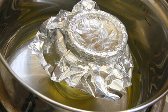Benmari usulu su ısıtın ve suyun içine ikinci küçük bir kap koyun ve onun içine de kavanozunuzu koyun. Suyu kaynamaya bırakın.