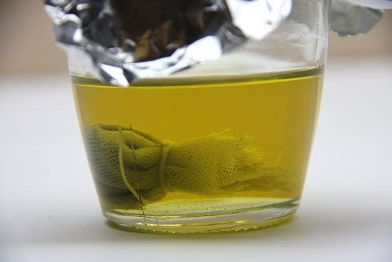 45 dakika bu şekilde bırakın. Benmarideki buhar karanfilin içindeki analjezik özellikleri yağa aktaracak.